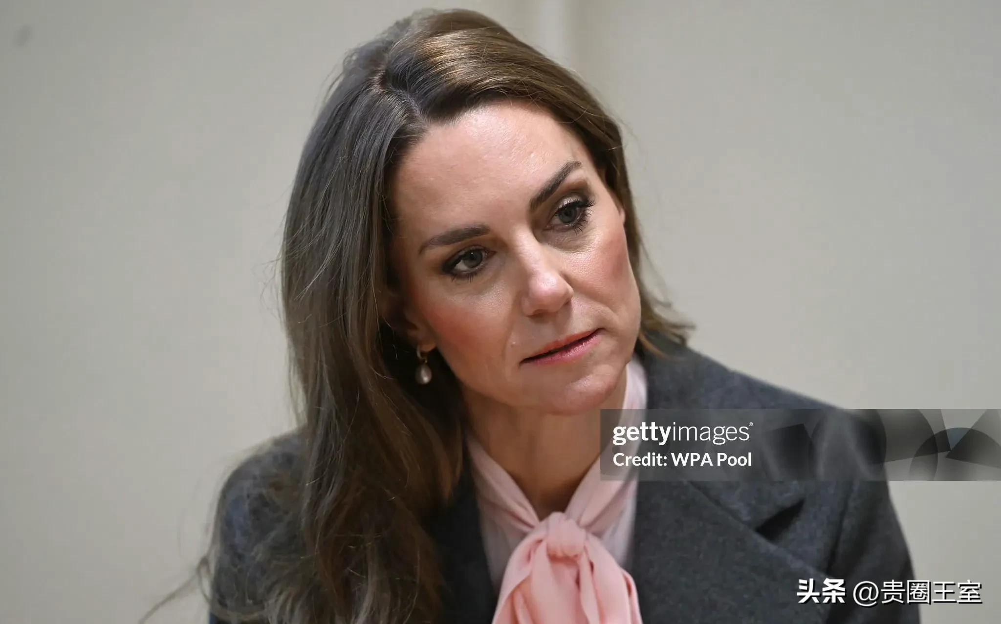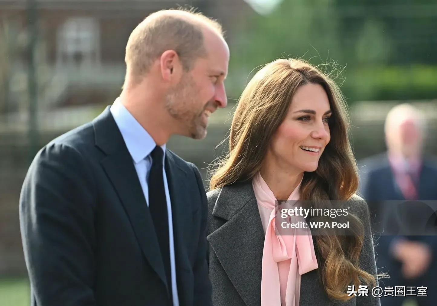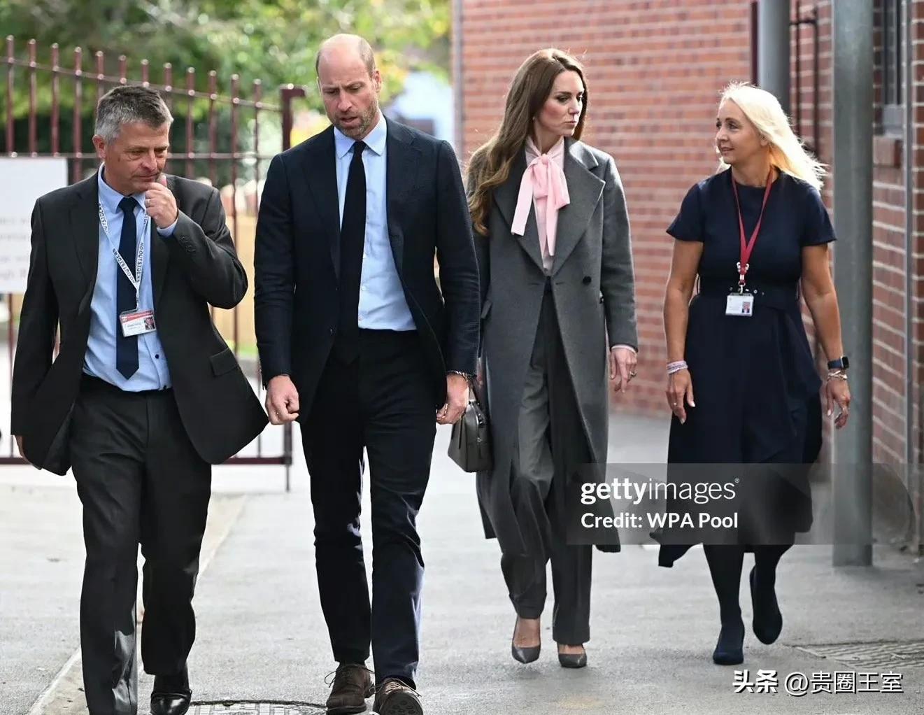 今天凯特王妃的穿搭一如既往的优雅知性,灰色长款大衣内搭粉色衬衫,下穿西裤脚踩高跟鞋。
