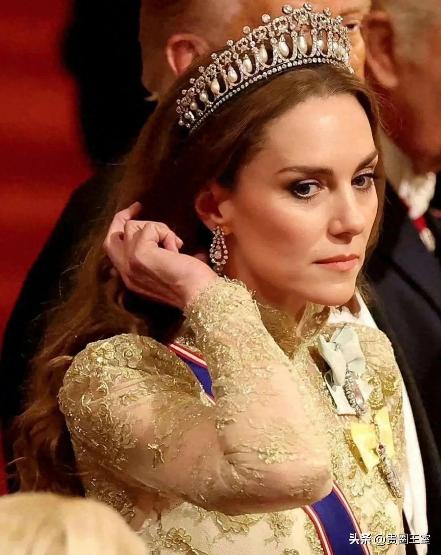 凯特王妃最新一次国宴造型备受好评,当天凯特王妃一身金色礼服搭配“珍珠泪王冠”中财所,一头标志性的波浪卷发美的很出众!