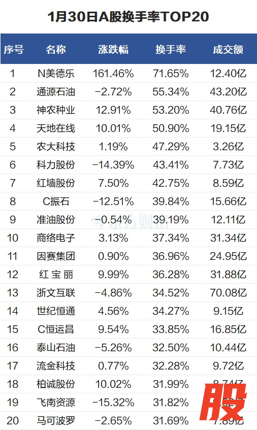 当天换手率最高的个股为N美德乐,全天换手率71.65%。通源石油紧随其后,全天换手率55.34%。