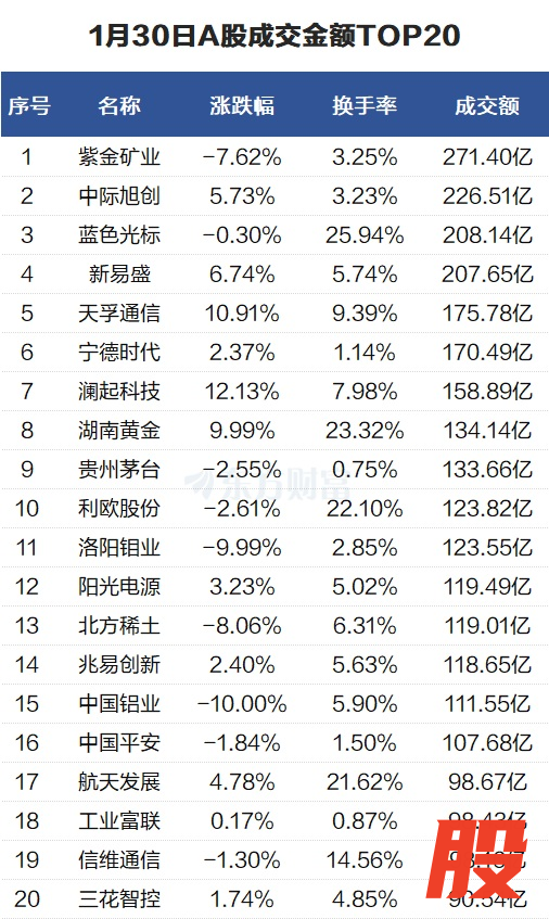 沪深两市成交额2.84万亿元,较上一交易日缩量3945亿元。个股方面,紫金矿业当日成交271.4亿元。中际旭创当日成交226.51亿元。