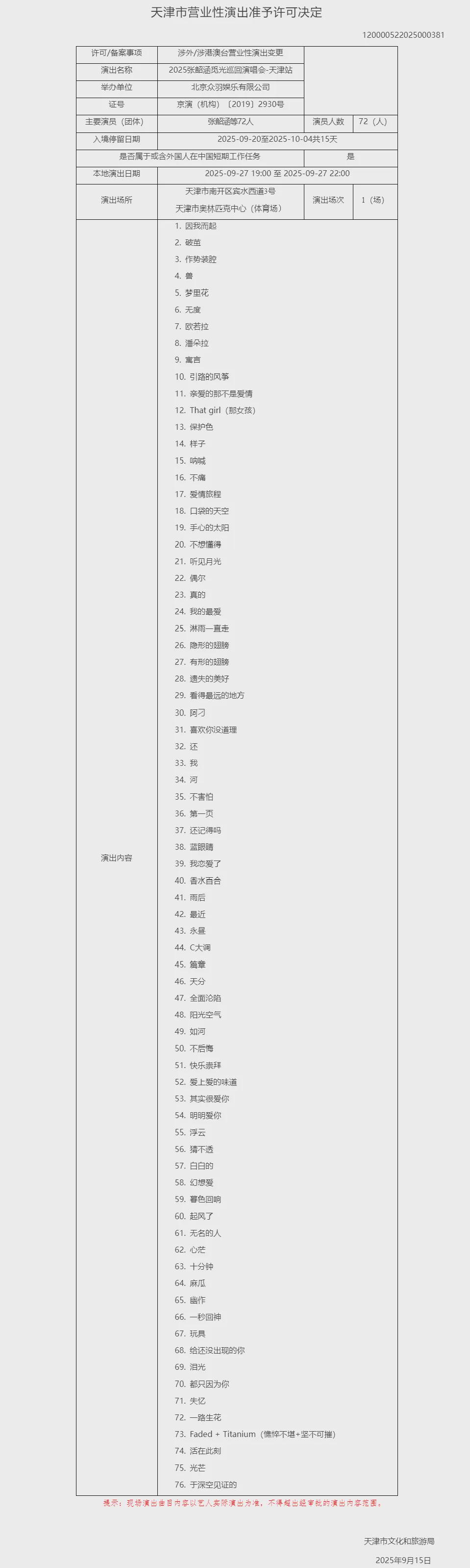 9月15日金多多策略,天津市文旅局网站再次发布《2025张韶涵觅光巡回演唱会-天津站》审批公示。与今年6月3日发布的公示信息相比——