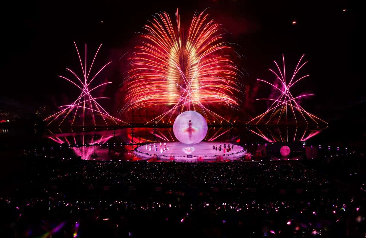 “烟花光塔”是目前世界上最高的烟花发射装置,作为本次花炮节贯穿始终的核心介质与艺术图腾,把抽象的“光年”具象成可触摸的视觉奇观,幻化为“生命之树”“艺术之塔”“科技之光”等形态,塑造了烟花贯通天地、抵达万物的最新意象。整个舞台以“烟花光塔”为轴心,构建出一个无边界、多维度、大交互的视觉系统,将“一河诗画”的自然景观、“满城烟花”的唯美意境与美妙灵动的舞台艺术、变幻万千的尖端科技巧妙融合,完成一场“跨越光年相见美好”的深度抵达。总导演黄成表示,“把光聚成塔,其实就是把我们的文化记忆聚在一起,让那些散落在时光里的梦想重新被看见,让藏在心底的美好情感一起被照亮,让烟花把每个人都拥有的青春火种瞬间点燃。”