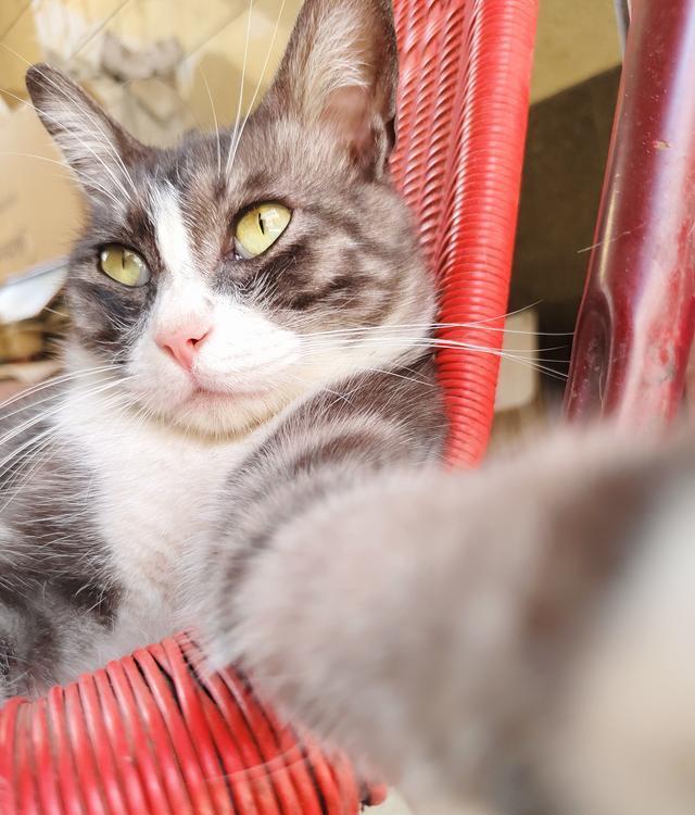 哆哆是一只拥有着漂亮斑纹的猫咪,第一次见到它时,是高中同学在朋友圈中发的领养启示,它正蜷缩在纸箱的角落,一双圆溜溜的眼睛怯生生地打量着周围。询问了高中同学的住址,那时的它,毛发有些凌乱,眼神里满是不安。我走上前,轻轻伸出手,它犹豫了一下,还是小心翼翼地用鼻尖碰了碰我的手指。就是这一个小小的动作,让我知道,我们之间的缘分开始了。