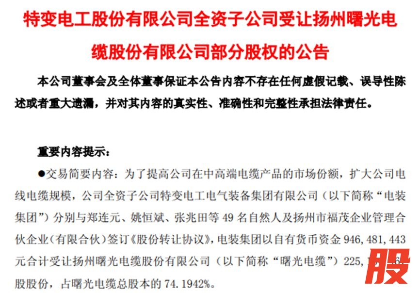 公告显示,本次股份转让价格参考上海申威资产评估有限公司对曙光电缆股东全部权益价值评估值,经各方协商确定股权受让总价款约9.46亿元。